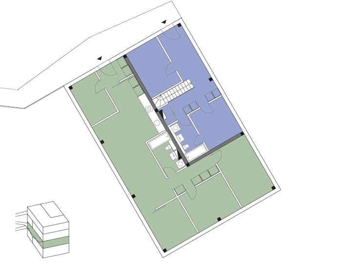 1st prize in the competition Ungewöhnlich Wohnen, organized by the Bremen housing association GEWOBA for five sites. Modernization and expansion of a 1950s public housing project, providing a wider range of unit sizes and plan types, and improved links to the neighborhood. The new buildings are linked to the existing slab blocks by walkways, providing step-free access to all units. New units have a semi-independent Optionsraum, which can be used as a home-office, or a bedroom for an older child or guest.