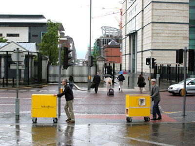 Yellow Space is a project of Belfast-based Building Initiative. Building Initiative aims to reintroduce a politics of place to Belfast by developing public consciousness of built environment issues. Yellow is the colour of consensus, utility, and universal access – exactly those qualities one expects to find and enjoy in cities. The Yellow Box was used to distribute copies of the broadsheet 'Yellow Press' at various locations in Belfast.